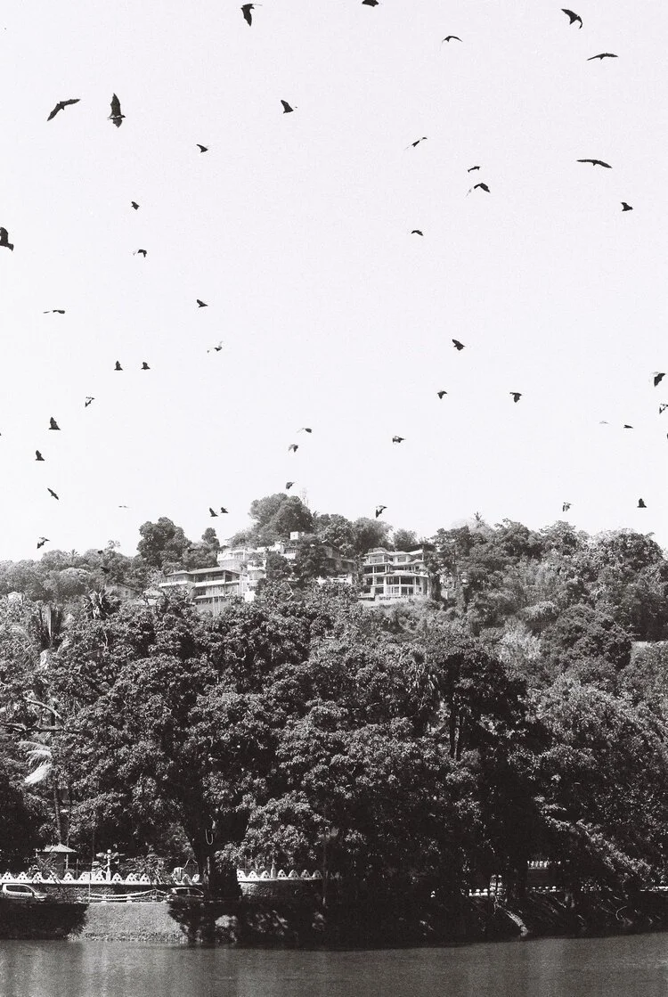 Opening day of cricket matches in Kandy, Sri Lanka begins with cacophony. Students form a parade, blowing horns, shooting flames, playing music, and cheering for their favorite team. As a result, thousands of Indian fruit bats (Flying Foxes) are awakened from their slumber to migrate in the rising sunlight to the quiet side of the lake—only to reawaken every 20 minutes as the symphony circles.
